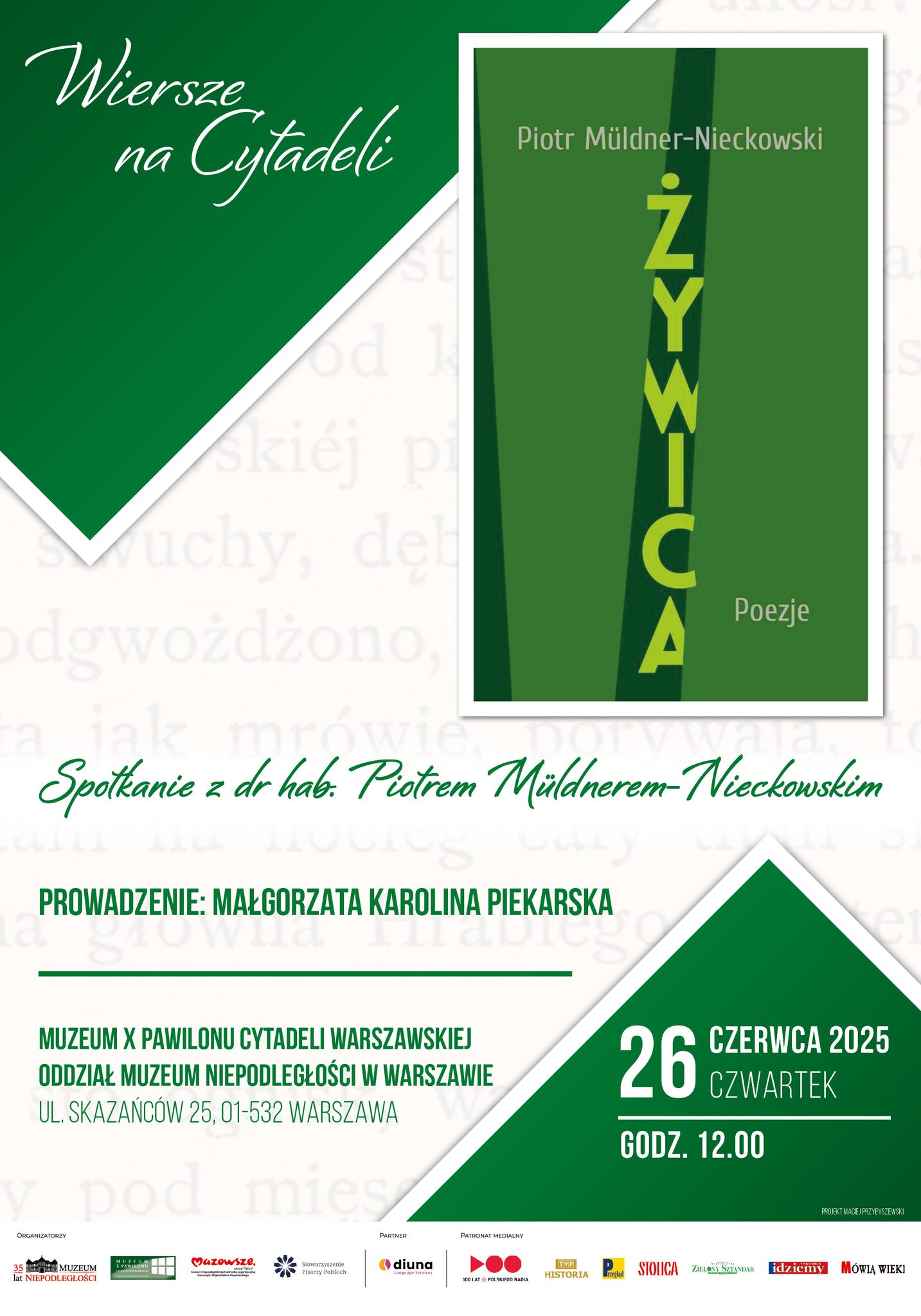 „Wiersze na Cytadeli” to cykl spotkań literackich w Muzeum Niepodległości, organizowany we współpracy ze Stowarzyszeniem Pisarzy Polskich, którego celem jest promocja współczesnej poezji polskiej i światowej. Większość spotkań prowadzę osobiście. Muzeum na wydarzenie zaprasza następującymi słowami: